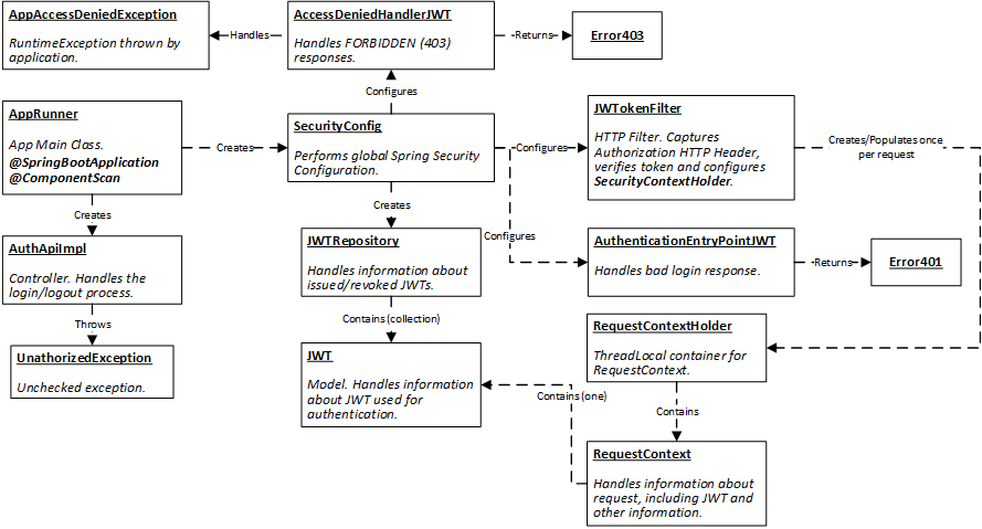 The main purpose of this implementation is to secure an application using Spring Boot. We assume that the application uses JWT for the purposes of user's authentication. Please, keep in mind that this is a very basic authentication/authorization mechanism designed for demonstration purposes only. In production, you should use more sofisticated mechanisms, like persistent repositories, etc.